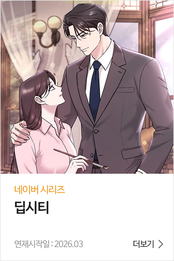 딥시티 장르: 여성향 로맨스 | 연재: 2026.03~ | 네이버 시리즈 SYNOPSIS 부산 최대의 환락가.어둠을 좀먹고 자라는 차가운 도시에서 악착같이 살아남았다.호텔 바텐더로 일하는 하늘의 진짜 임무는 가짜 위스키를 파는 것.어김없이 손님을 속여야 하는 평범한 어느 날, 숨이 멎도록 아름다운 남자 윤태훤을 만난다. “서하늘 씨는 참…… 재미있어.” 남자에게 본능적인 끌림을 느끼면서도 동시에 그가 위험한 인간이라는 것을 알아차린다.애써 태훤을 멀리하려 하지만, 결국 계약으로 얽히게 되고 마는데……. “계약을 파기하고 싶습니다.”“돈만 받아먹고 튀겠다는 건가. 그렇게는 안 되겠는데.”“처음부터 대표님이 제 그림 따위엔 관심 없었다는 거 알아요. 그냥 재미로 절 가지고 놀 생각이었던 것도.”“지금 내 꼴을 봐요. 누가 누굴 가지고 노는 중인지.” 목덜미에 쏟아지는 남자의 숨이 한결 짙어졌다. “이런 기막힌 장소에서 아다를 뗄 줄은 몰랐는데.”“아, 아다요?”“왜요, 걸레 쪽이 하늘 씨 취향이에요?”“그, 그런 건 아니지만…….” 투명하게 빛나는 갈색 눈동자에 짓궂은 장난기가 서려 반짝였다. “아무 데나 쑤시고 다닌 걸레보단 이왕이면 청결한 게 낫잖아.” 과연 하늘은 태훤과의 계약에서 벗어날 수 있을까? 원작 | 정은동각색 | 모노그림 | 코알담당PD | 송인철