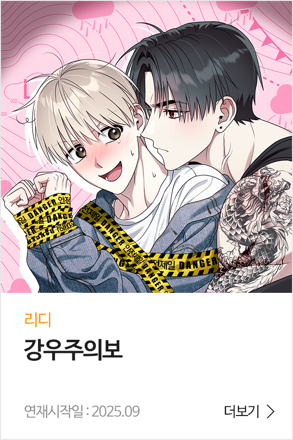 강우주의보장르: 성인BL | 연재: 2025.09~ | 리디 SYNOPSIS 내가 사라진 8년 동안 동네에서 유명한 조직 폭력배가 되어 버린 최강우.그 차갑고 무서운 최강우가 아직도 나를 좋아한다. 글 | 살원그림 | 감자농부채색 | 농장쥐, 살원배경 | 살원도움 | 햄철이담당PD | 이윤호
